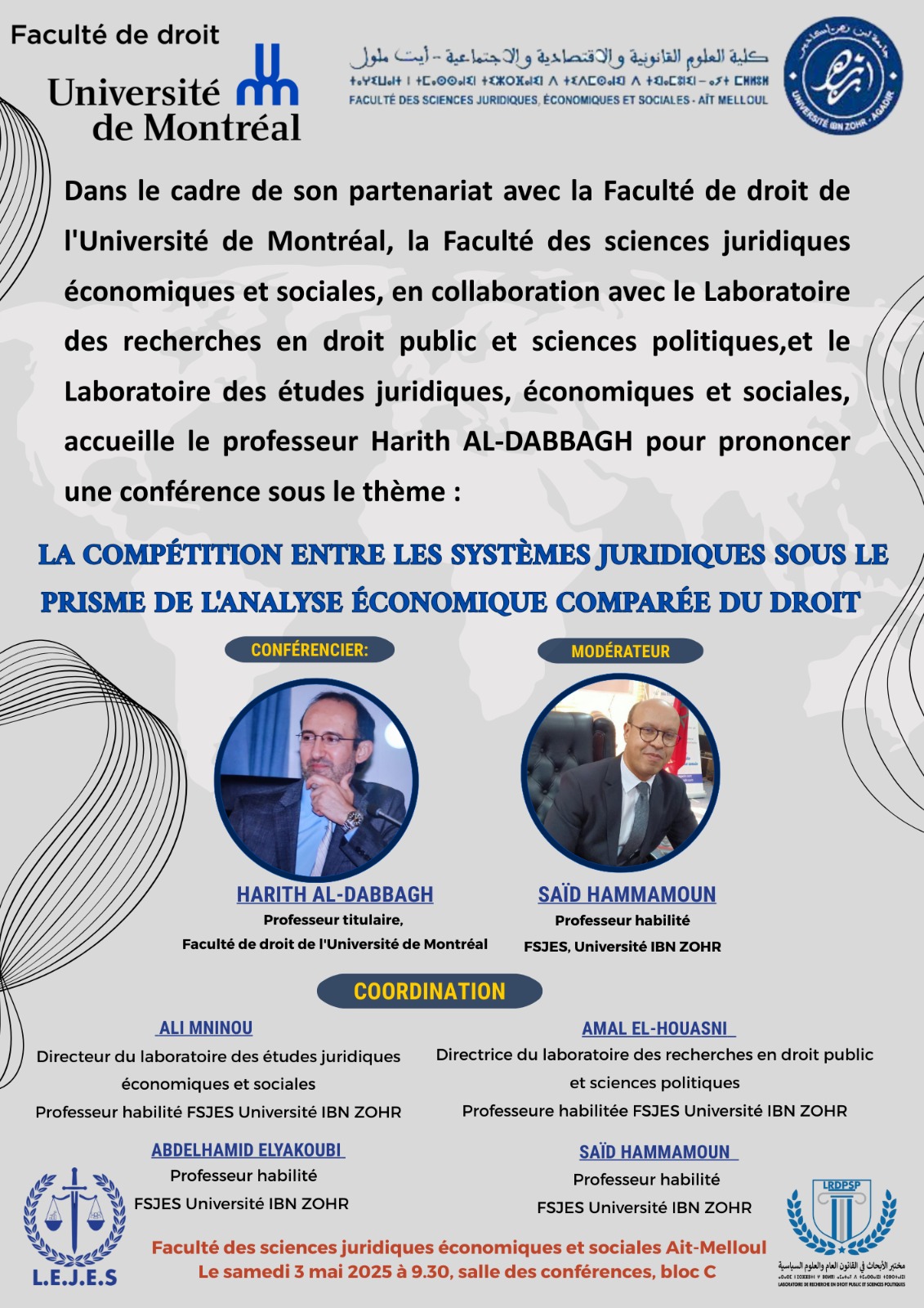L’évènement a été organisé dans le cadre du partenariat avec la Faculté des sciences juridiques, économiques et sociales (campus Aït-Melloul), Université Ibn Zohr, Agadir, au Maroc, en collaboration avec le Laboratoire des recherches en droit public et sciences politiques et le Laboratoire des études juridiques, économiques et sociales.